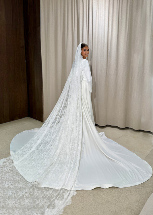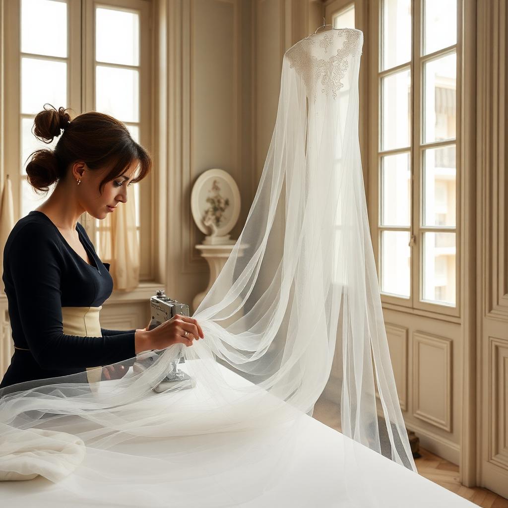 Chaque voile de notre collection est une pièce unique, confectionnée à la main dans notre atelier parisien. Tulle français d'exception, broderies artisanales, finitions invisibles.